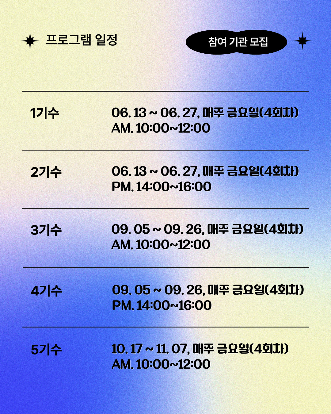 • 교육기간: 2025-06-13 ~ 2025-11-07 00:00 ~ 00:00 매주 금요일
