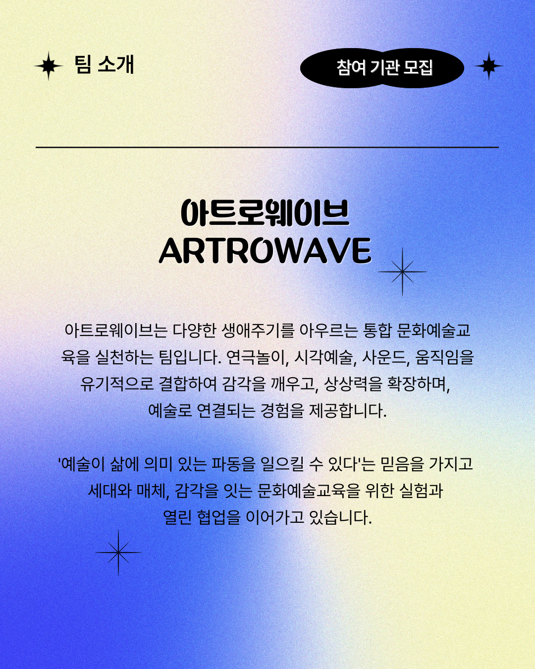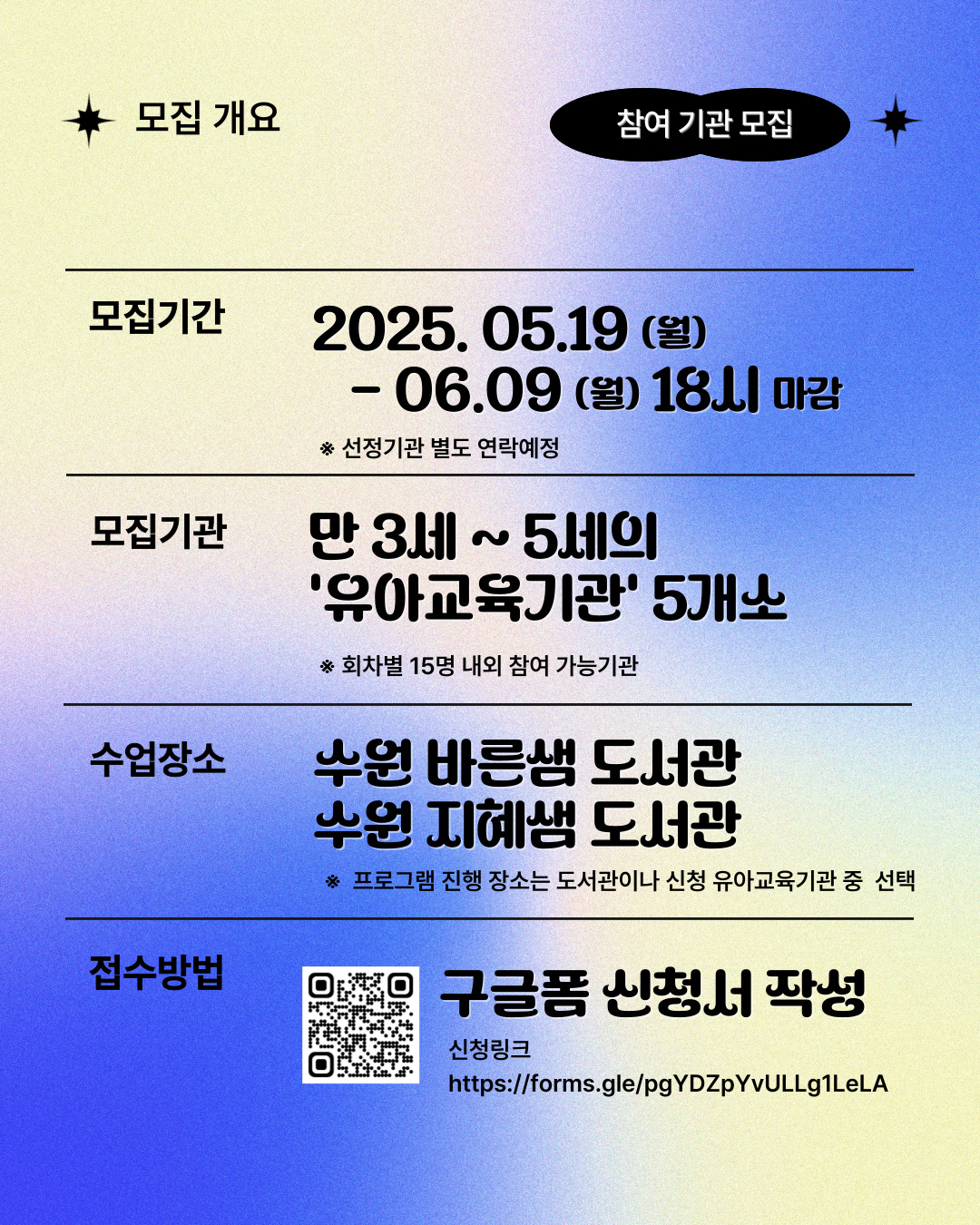 • 교육장소: 수원 바른샘 도서관, 수원 지혜샘 도서관 또는 신청 어린이집(창작활동이 가능한 공간, 유희실 등)