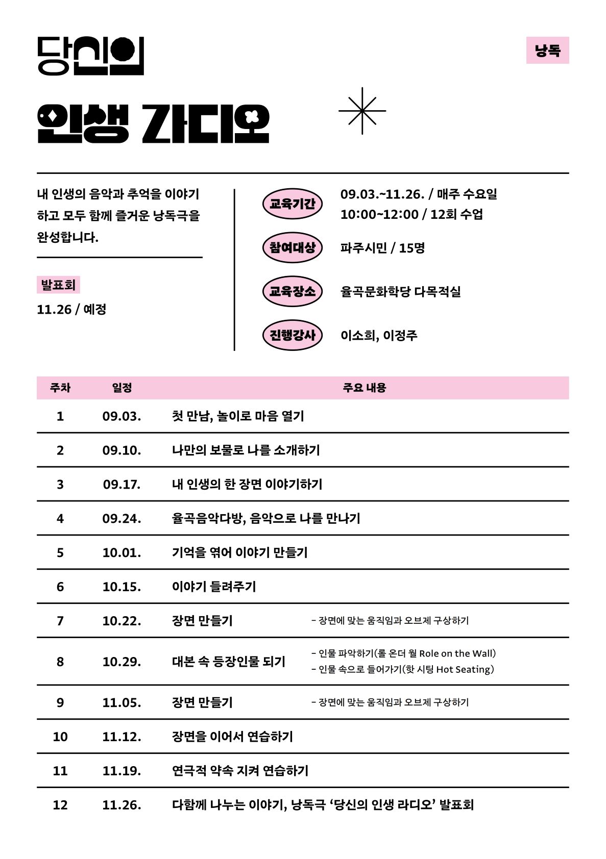 • 교육기간: 2025-09-03 ~ 2025-11-28 10:00 ~ 12:00 사진 참고