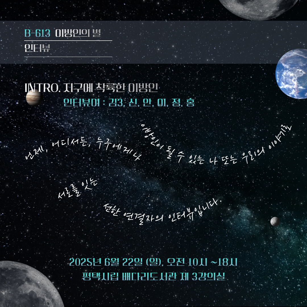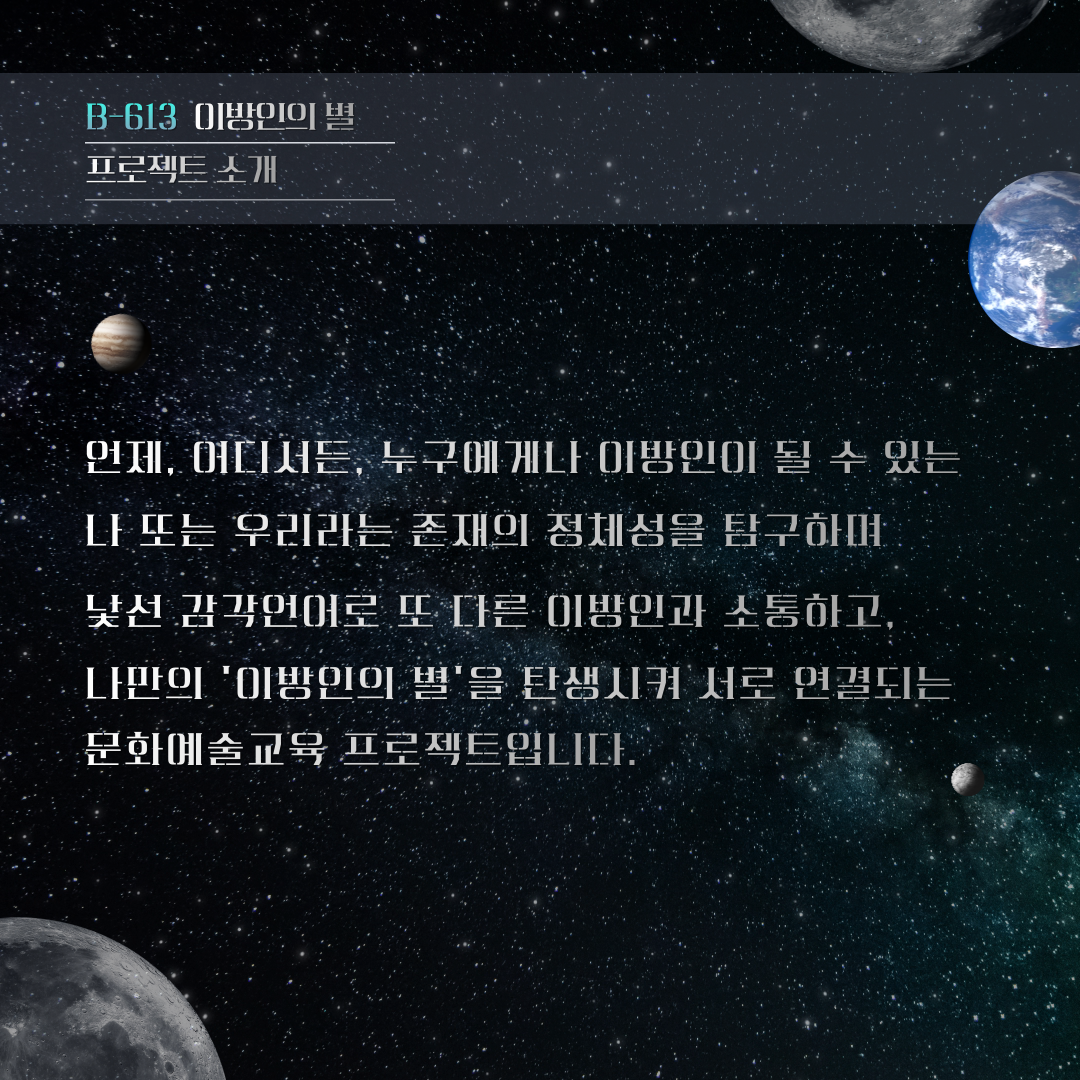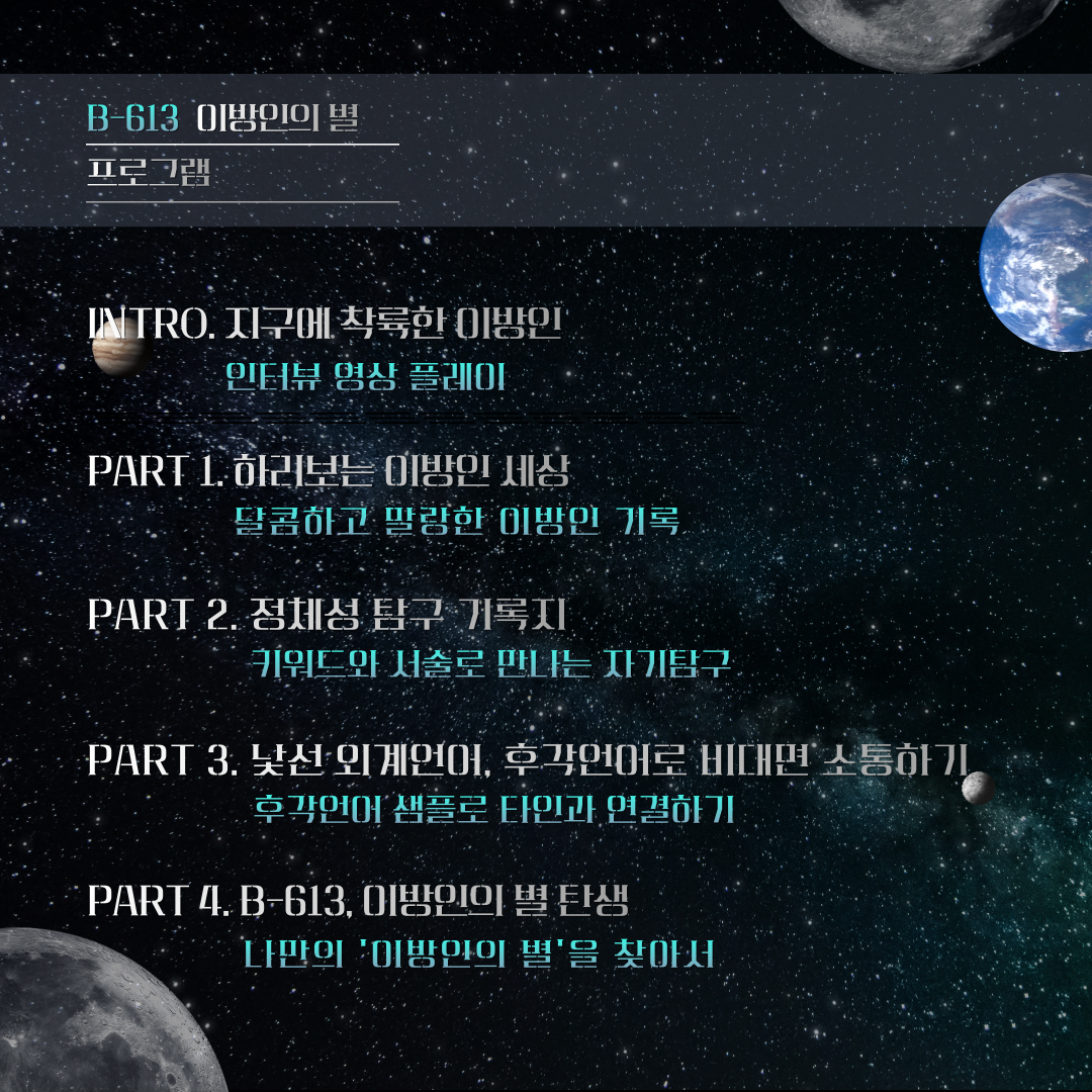 ▫ 프로그램 : 하리보는 이방인 세상▸정체성 탐구 기록지▸낯선 외계언어, 후각언어로 비대면 소통하기▸B-613,이방인의 별 탄생