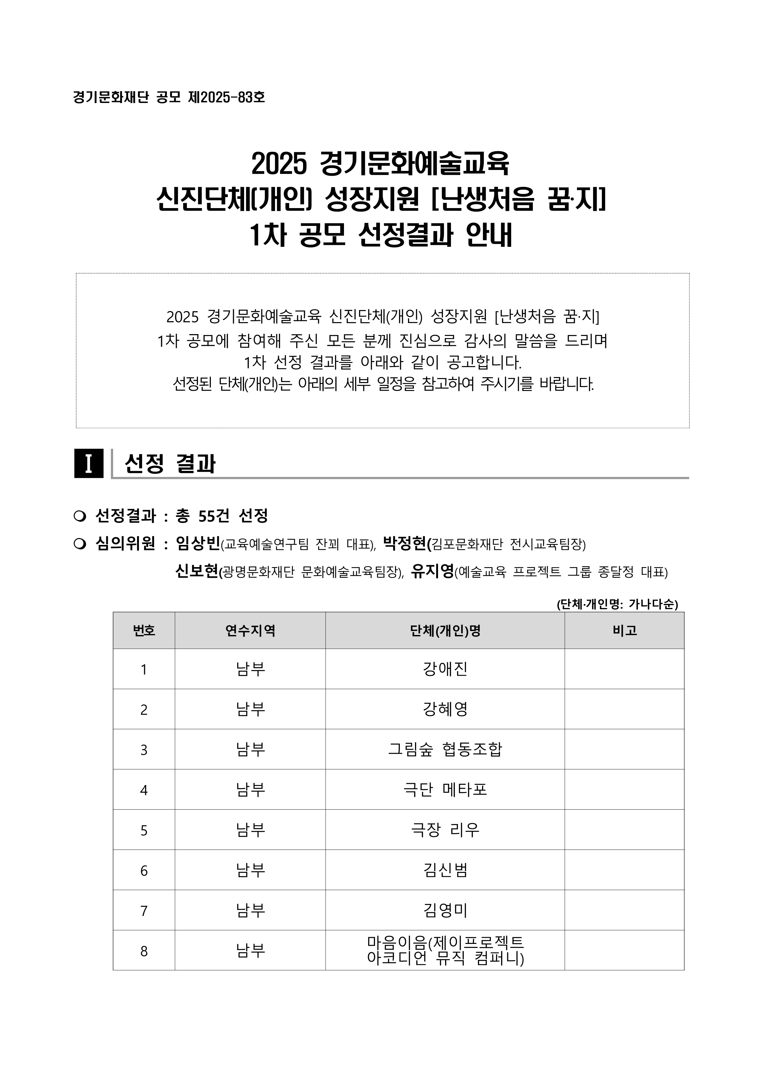 • 2025 경기문화예술교육 신진단체(개인) 성장지원 [난생처음 꿈지] 1차 공모 선정결과 안내